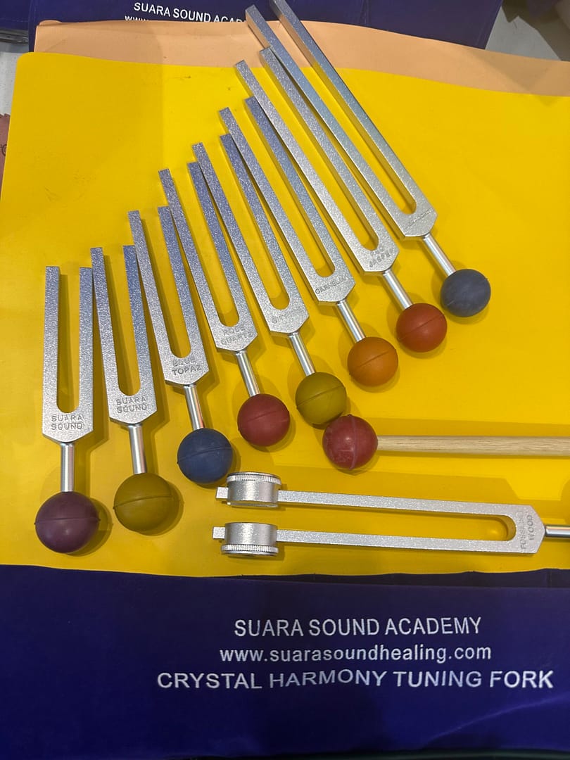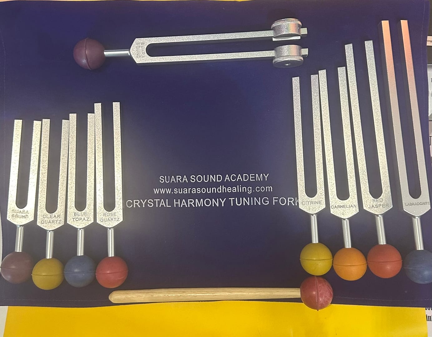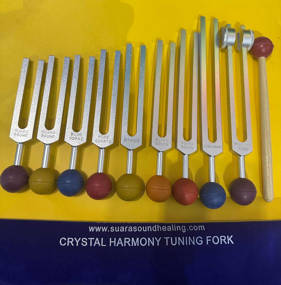 This amazing Crystal Harmony tuning fork set contains 9 forks including 1 weighted .